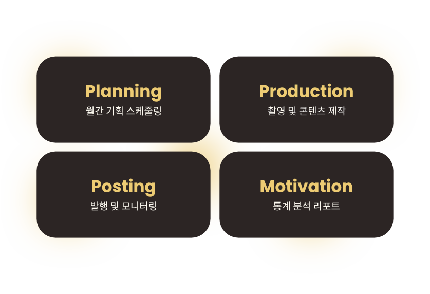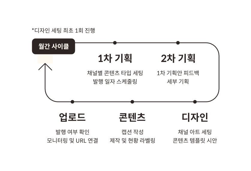 디자인 세팅, 콘텐츠 제작, 업로드까지 최소 3개월 월 관리 시스템으로 운영하여 콘텐츠의 지속 발행과 함께 브랜드 가치가 축적됩니다.